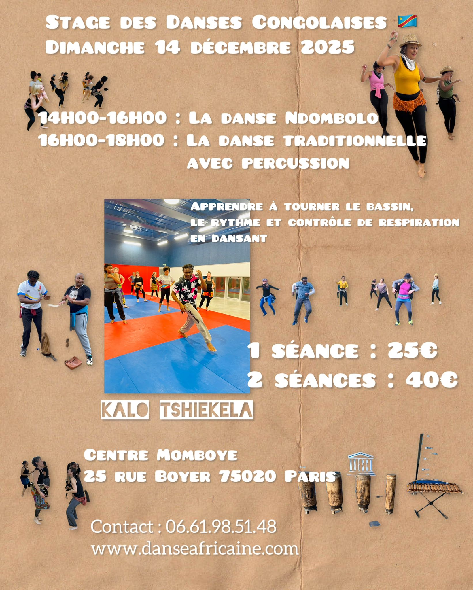 Kalo Tshiekela Cours de danse africaine du Congo Adresse : 25 rue Boyer, 75020 Paris Lundi : 19h15-20h45 – danse Traditionnelle congolaise Mardi : 19h15-20h45 – Ndombolo Jeudi : 19h15-20h45 – Mutuashi Tarifs : 1 cours 18€ Carte de 5 cours : 80€ Carte de 12 cours : 170€ Kalo75020@aol.com 0661985148